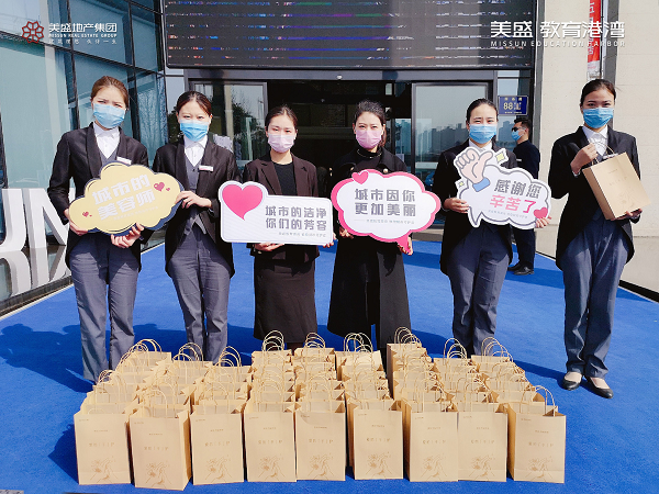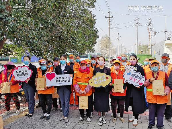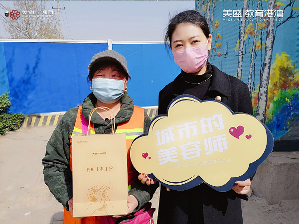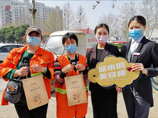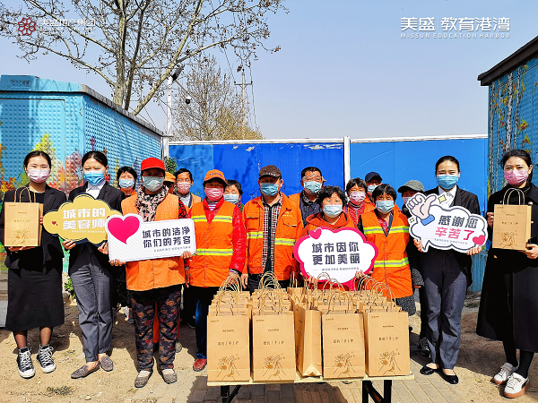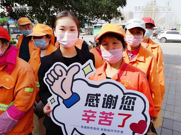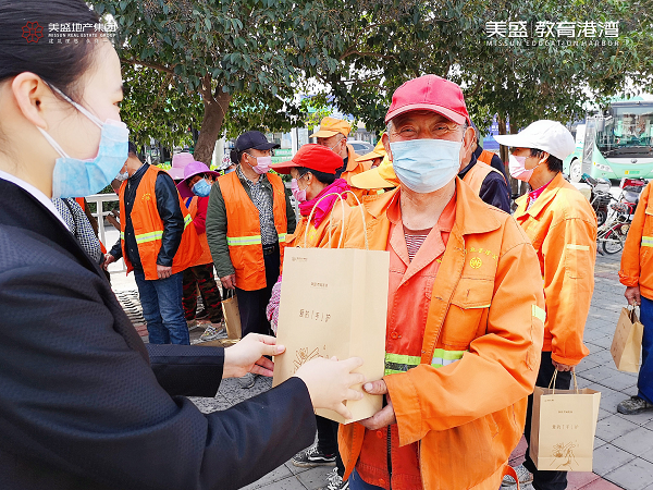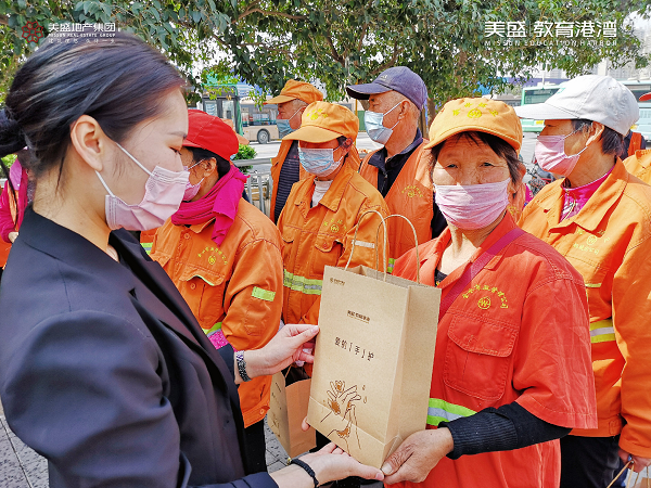 心懷感恩之情,3月20日,美盛教育港灣團(tuán)隊走到街頭一線,慰問那些堅守崗位一線的環(huán)衛(wèi)工作者,為守護(hù)他們的健康送上一份防疫大禮包。