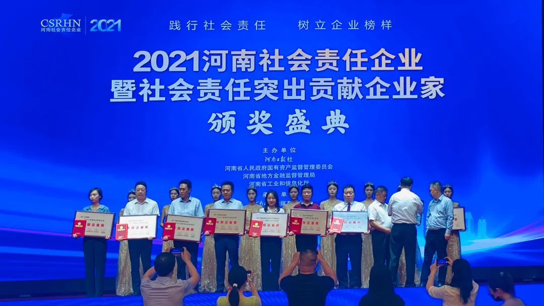 首頁 > 新聞中心 > 公司新聞2022年7月2日下午,由河南日?qǐng)?bào)社、河南省人民政府國有資產(chǎn)監(jiān)督管理委員會(huì)、河南省地方金融監(jiān)督管理局、河南省工業(yè)和信息化廳聯(lián)合主辦的“2021河南社會(huì)責(zé)任企業(yè)及社會(huì)責(zé)任突出貢獻(xiàn)企業(yè)家”推選活動(dòng)頒獎(jiǎng)典禮在鄭州黃河迎賓館迎賓會(huì)堂舉行。