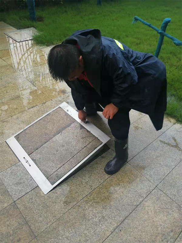 汛前做好下水管、污水井、污水泵檢查,備好防汛沙袋。下雨時(shí),及時(shí)巡查排水設(shè)施,檢查天臺(tái)、地庫有無積水,地庫入口堆放沙袋。
