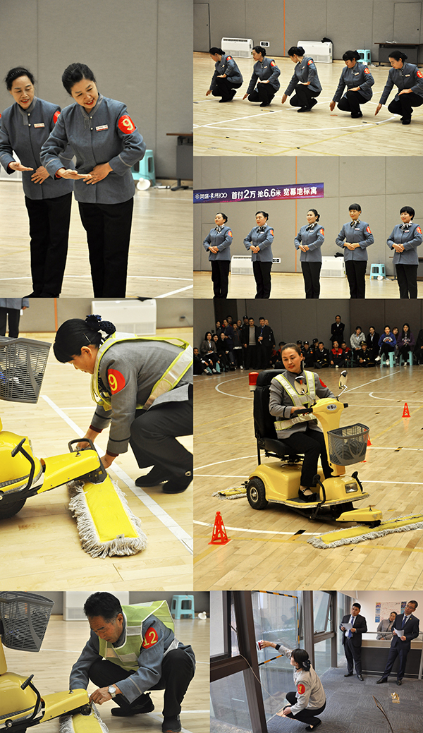窗明幾凈是衡量清潔服務最基礎的一項標準,在后期項目清潔服務工作中,窗戶清潔工作量大、這要求操作者要具備過硬的技能,靈活、安全的運用玻璃器來清潔窗戶,安全、高效的解決高空公區玻璃清潔問題。看我們參賽的各代表隊清潔能手,玻璃器在他們手中輕松滑動,猶如書法家的揮墨潑毫,一氣呵成,沒有絲毫的停頓,眼前的窗戶玻璃一塵不染,透過冬日的陽光,折射出不同的光彩。
