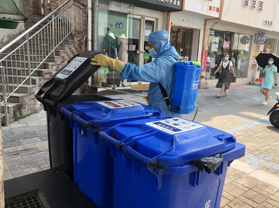 現(xiàn)場(chǎng)一遍遍消殺、消毒,維持秩序的物業(yè)工作人員