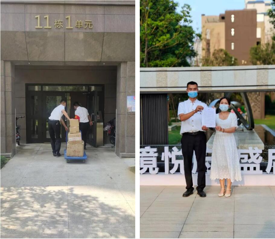 在8月18日這一天,鹿鳴湖壹號悅府小區有一位女士業主,因快遞太多,在帶著快遞到達小區西門后,小區的秩序領班王志輝和隊員王博正在門口執行卡點任務。在看到業主帶的快遞后,主動幫助業主進行快遞的消殺。同時他們立即取來小區的便民服務車,將業主的快遞放置在車上,一直幫業主送到門口。