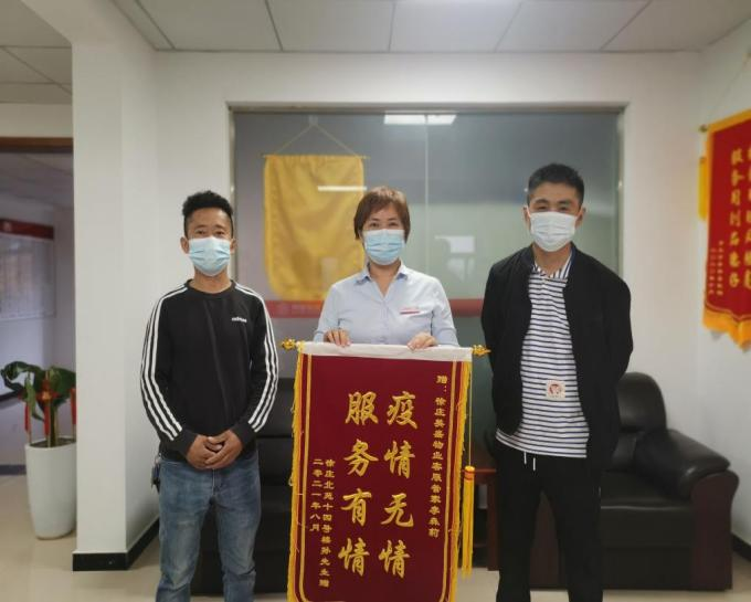 扛過鄭州最艱難的時期,一面遲來的錦旗,滿載沉甸甸的榮譽來到徐莊物業服務中心,沒有過多華麗的語言,只有兩行大字“疫情無情,服務有情”。管家李森莉這么久的默默付出,得到業戶由衷的認可,作為一名物業人,被日常這碎了一地雞毛事務圍繞的她,這一刻一定是幸福的。業戶的理解和認可,彌足珍貴。